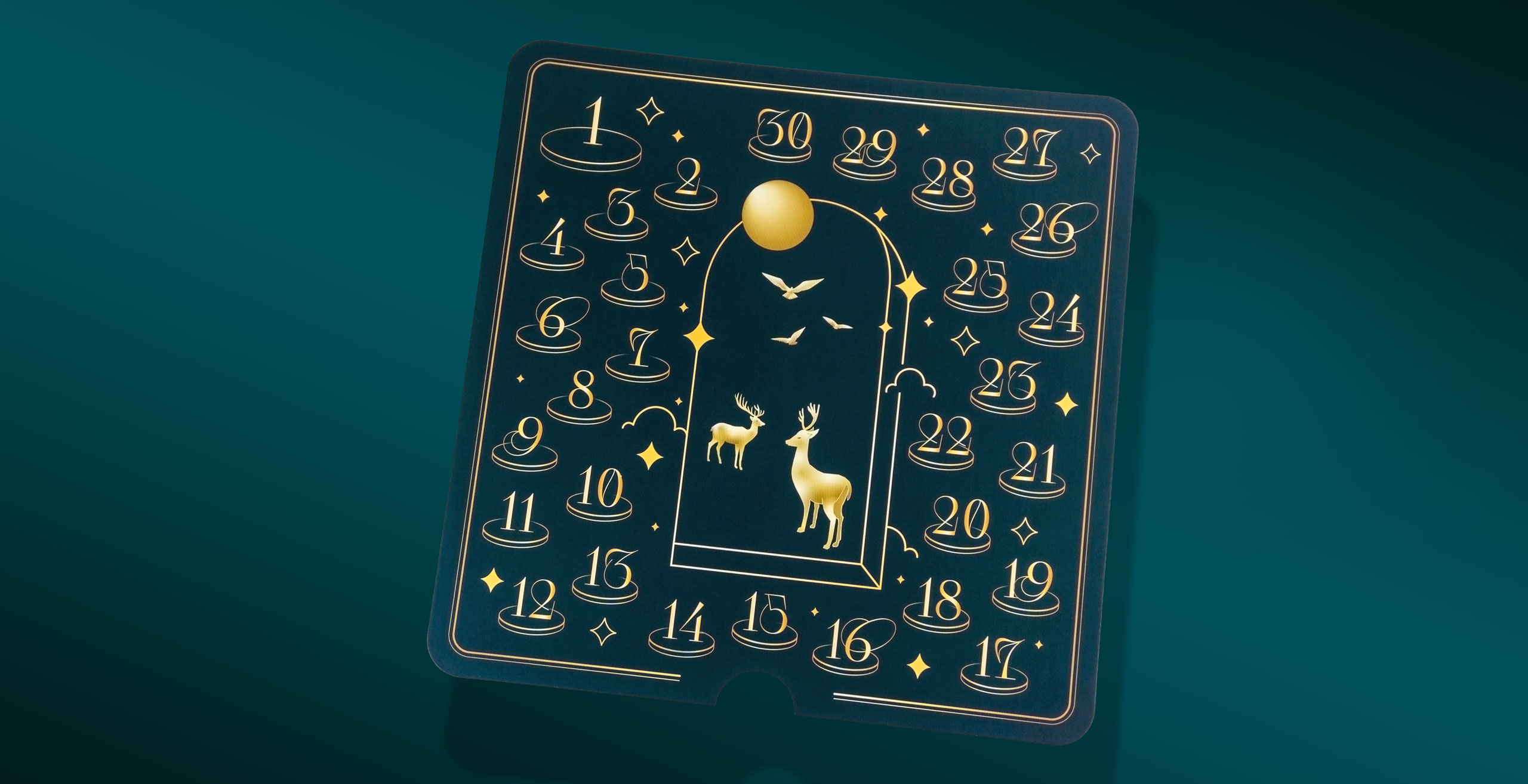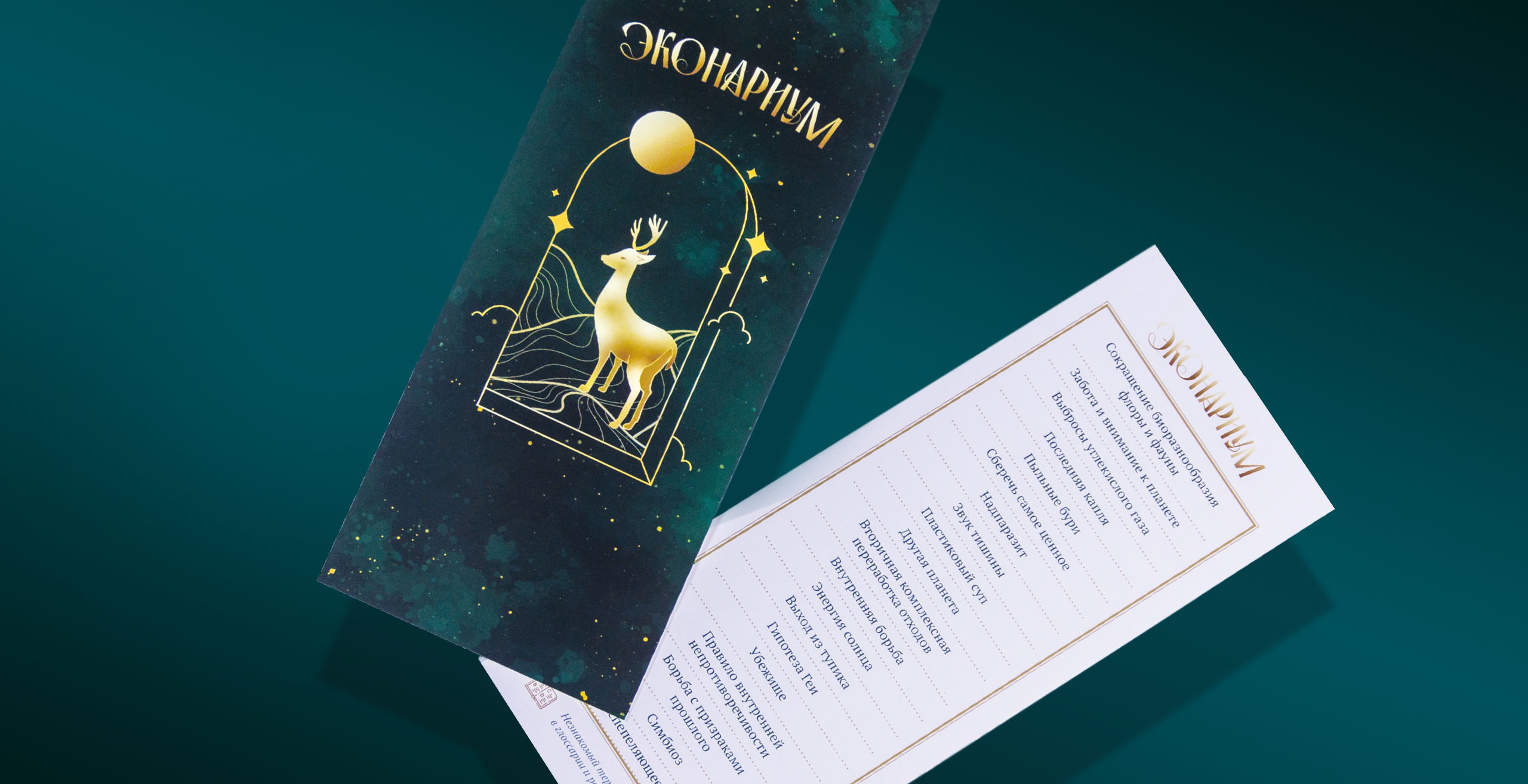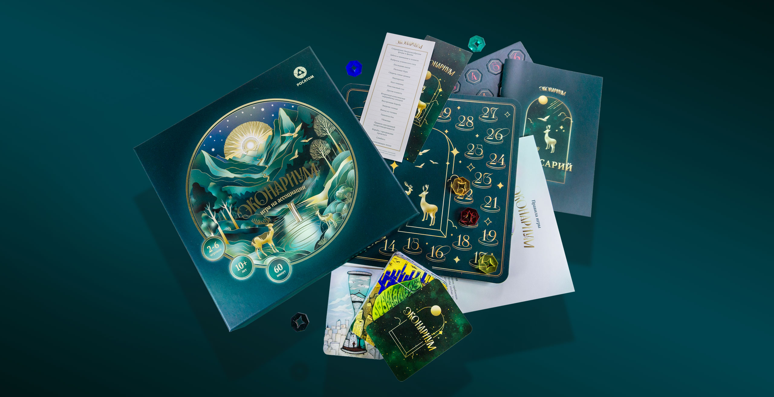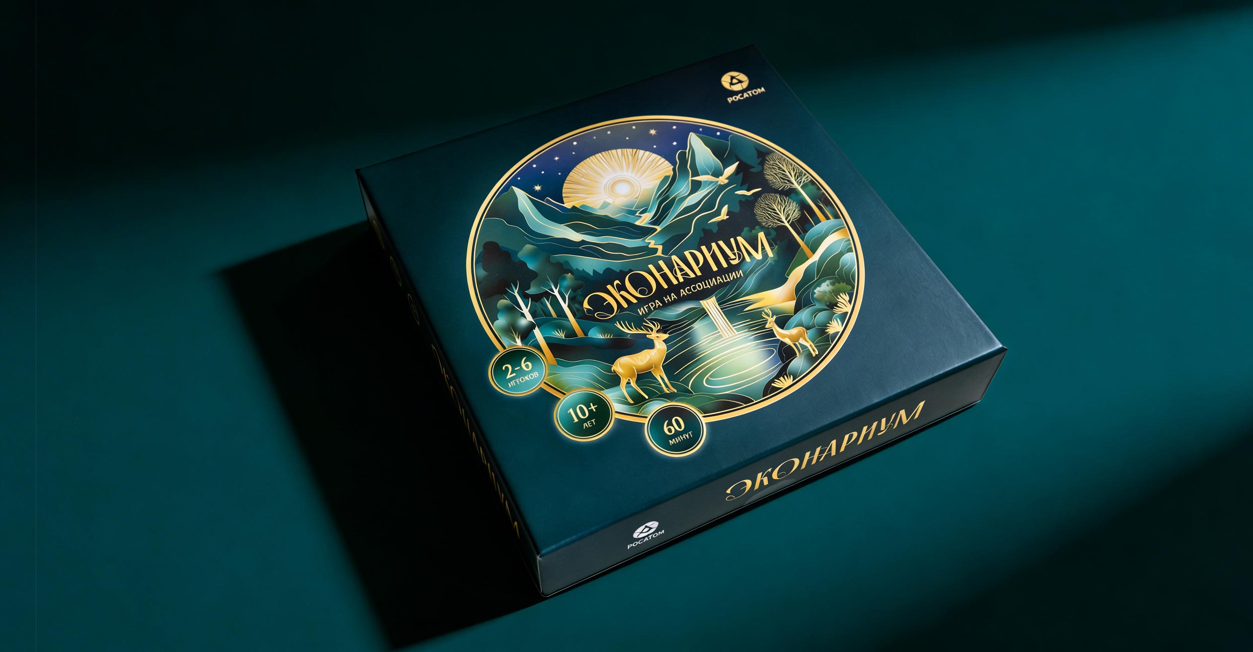 На коробке, отделанной золотым тиснением, мы расположили роскошный пейзаж как образ гармонии и равновесия в мире. Надеемся, что экологическое просвещение приведет когда-то к такому состоянию нашей планеты.