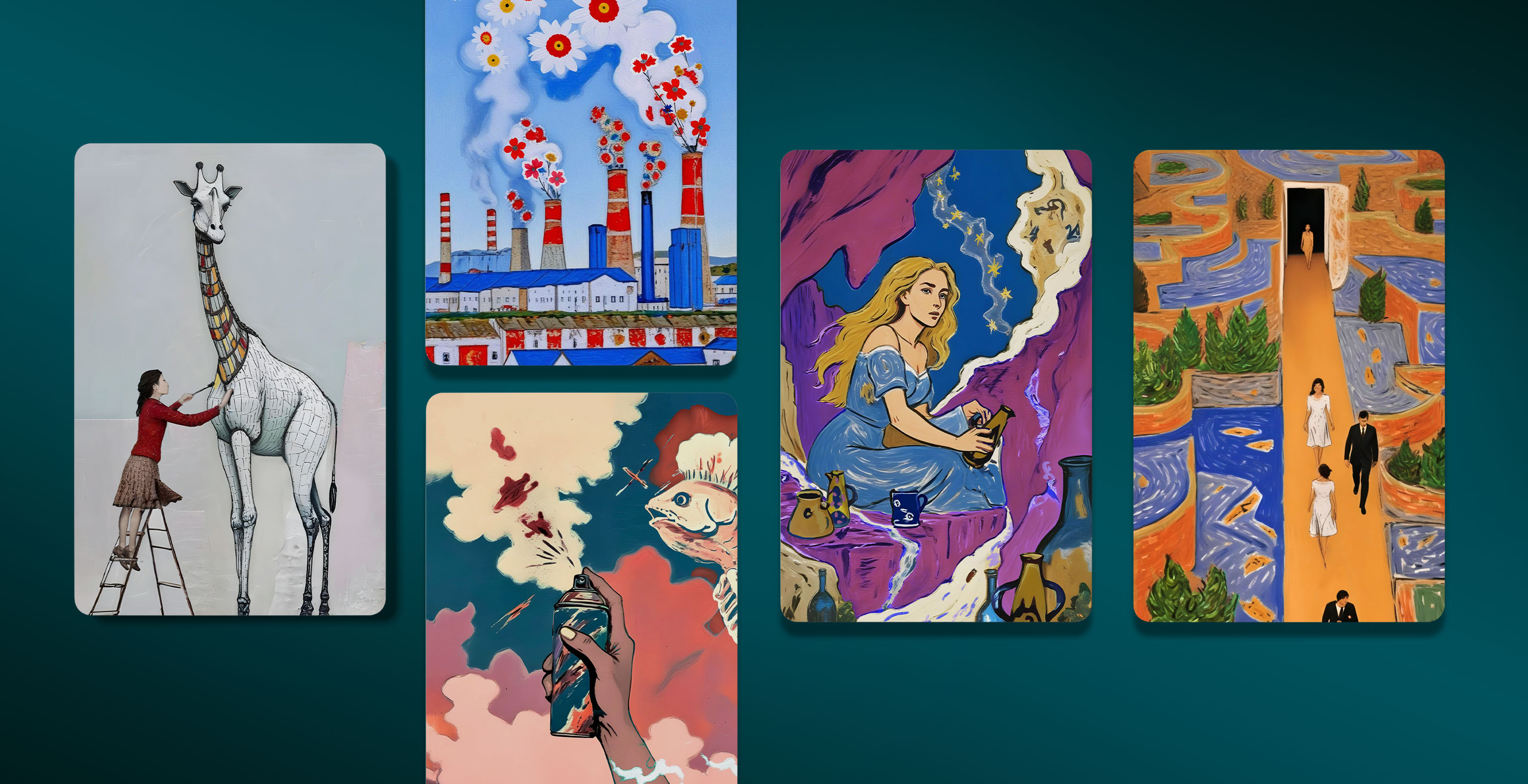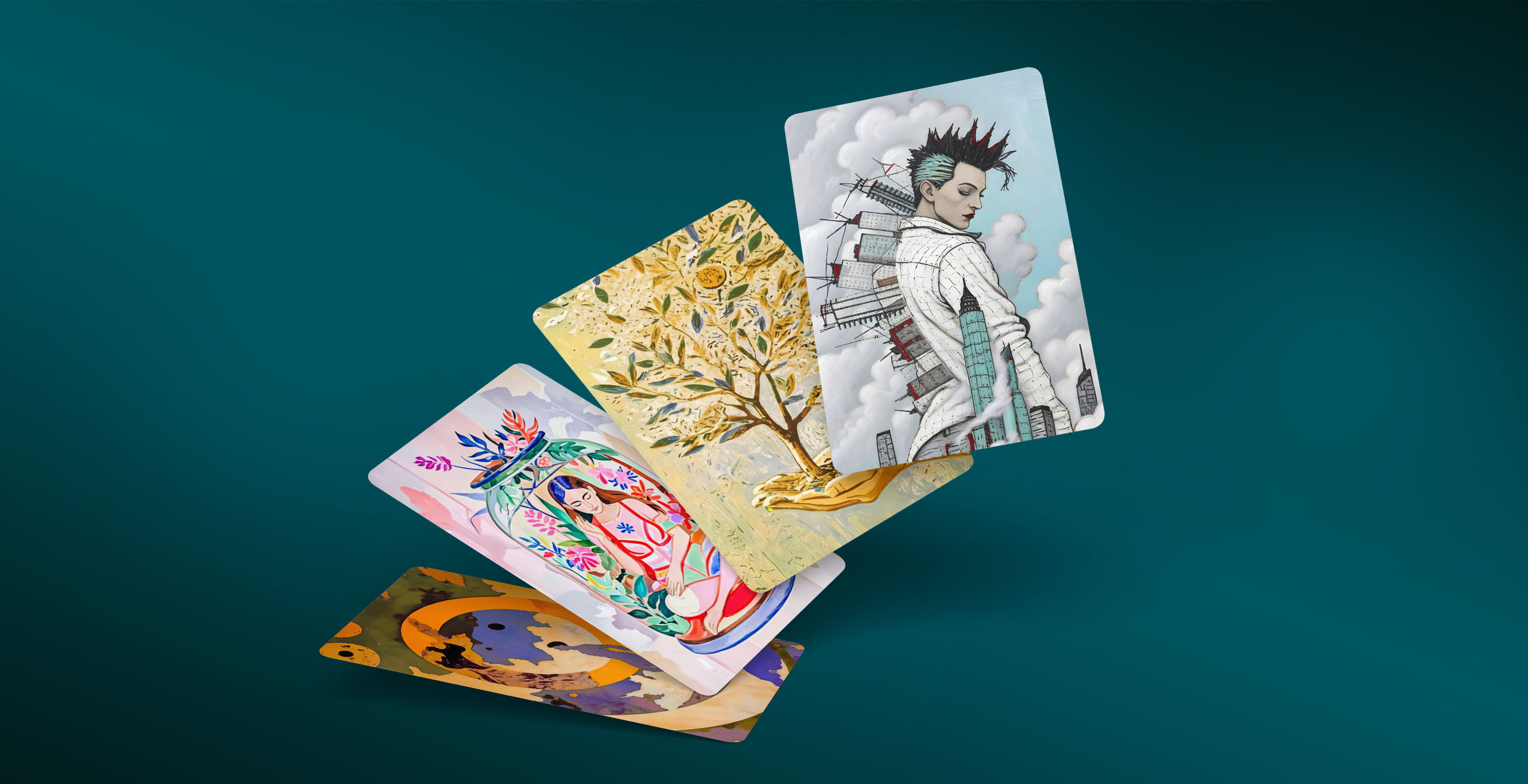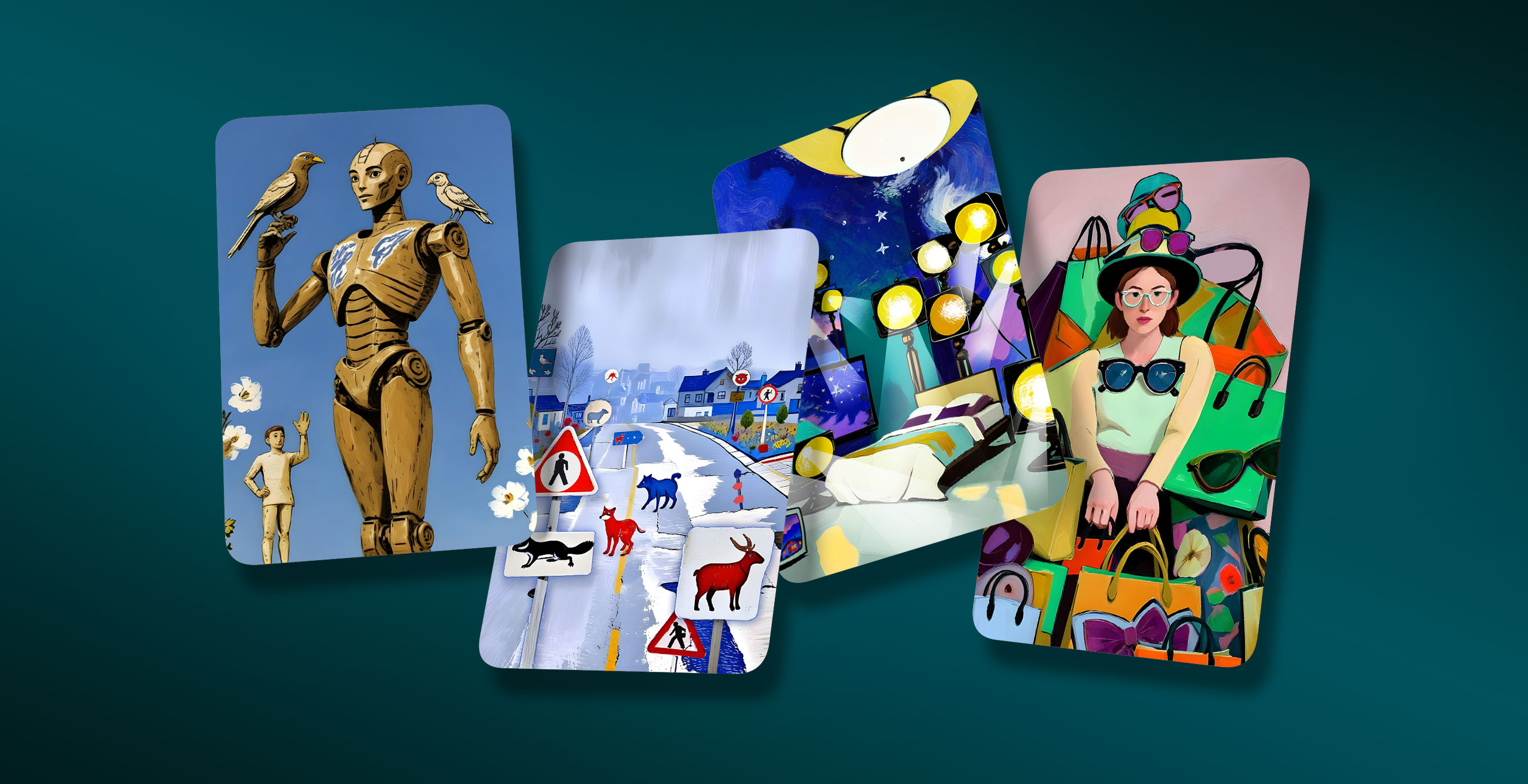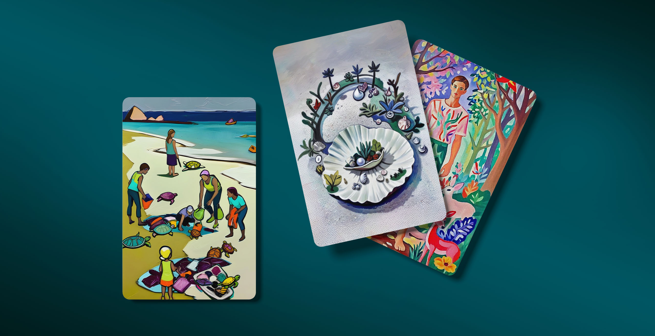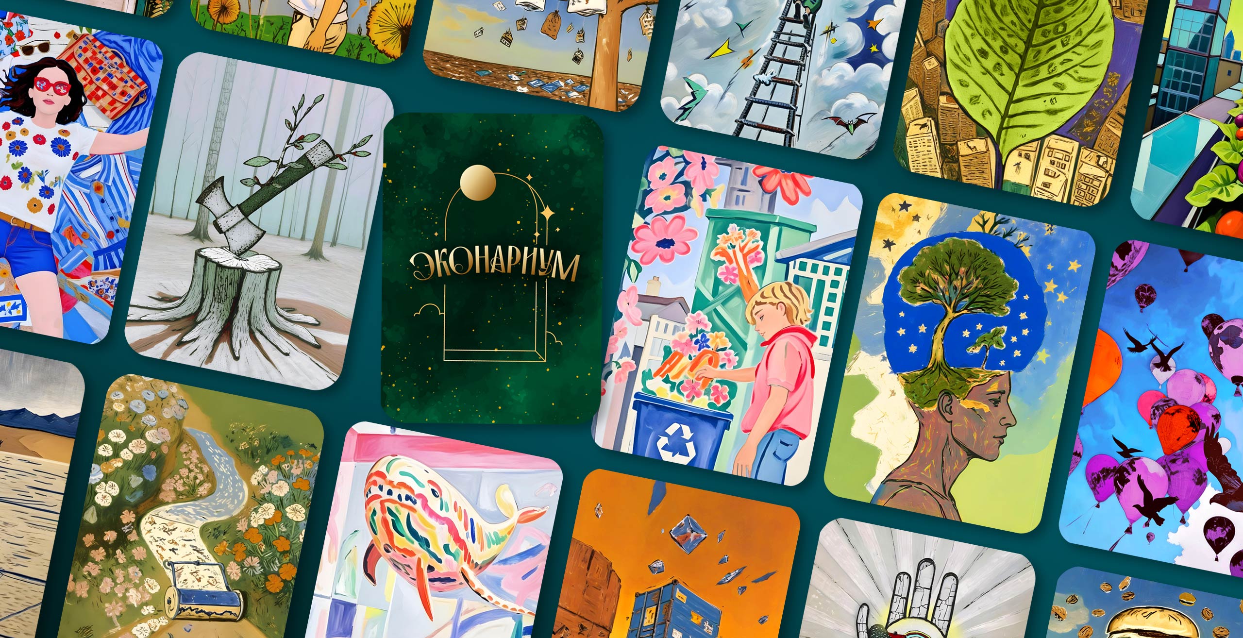 96 карт с иллюстрациями на экологическую тему – главный элемент игры. Иллюстрации созданы с помощью искуственного интеллекта. Мы использовали разные художественные техники и метафорические сюжеты и образы. Получились яркие фантазийные иллюстрации.