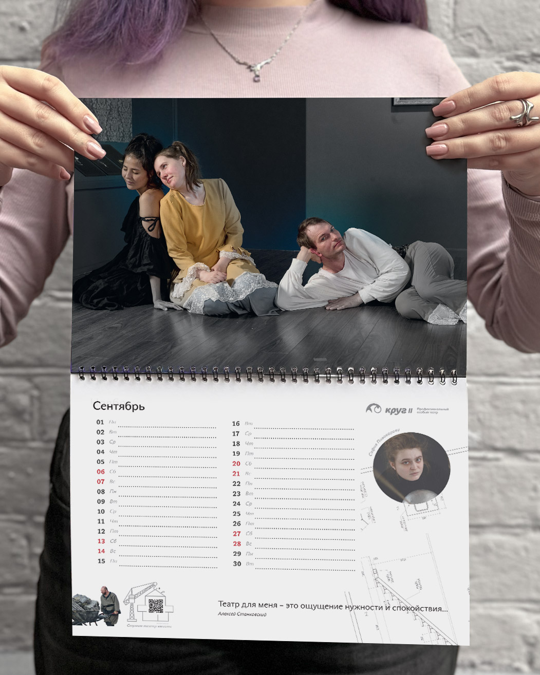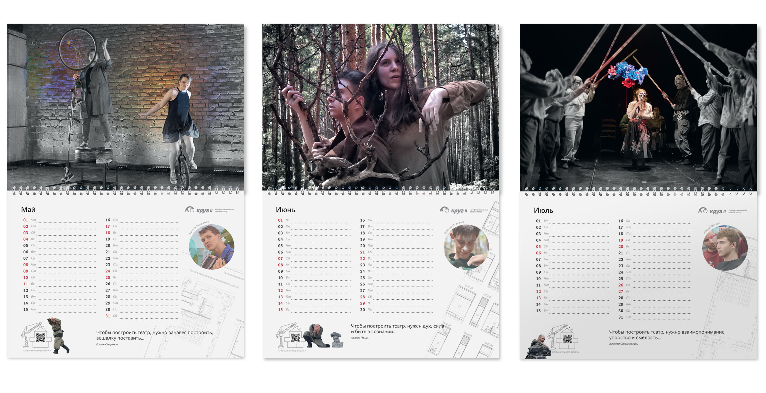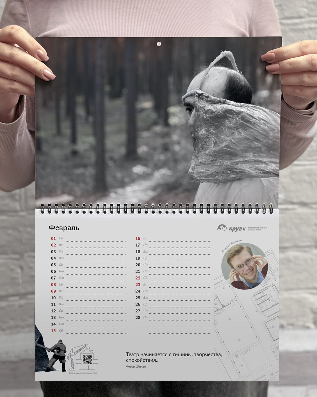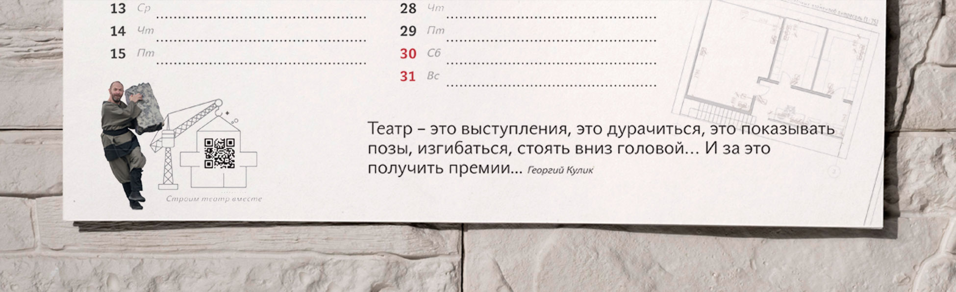 Особый театр «Круг II» — это профессиональный театр и обучающая театральная студия для людей с особенностями развития. На страницах календаря актеры размышляют над тем, что необходимо для строительства театра. Сквозь весь календарь нас сопровождает персонаж Степан из спектакля «Медь, малахит и ящерка». Он как будто строит здание театра в течение всего года. Фоном календаря служат чертежи дизайн-проекта театра, ждущие реализации.