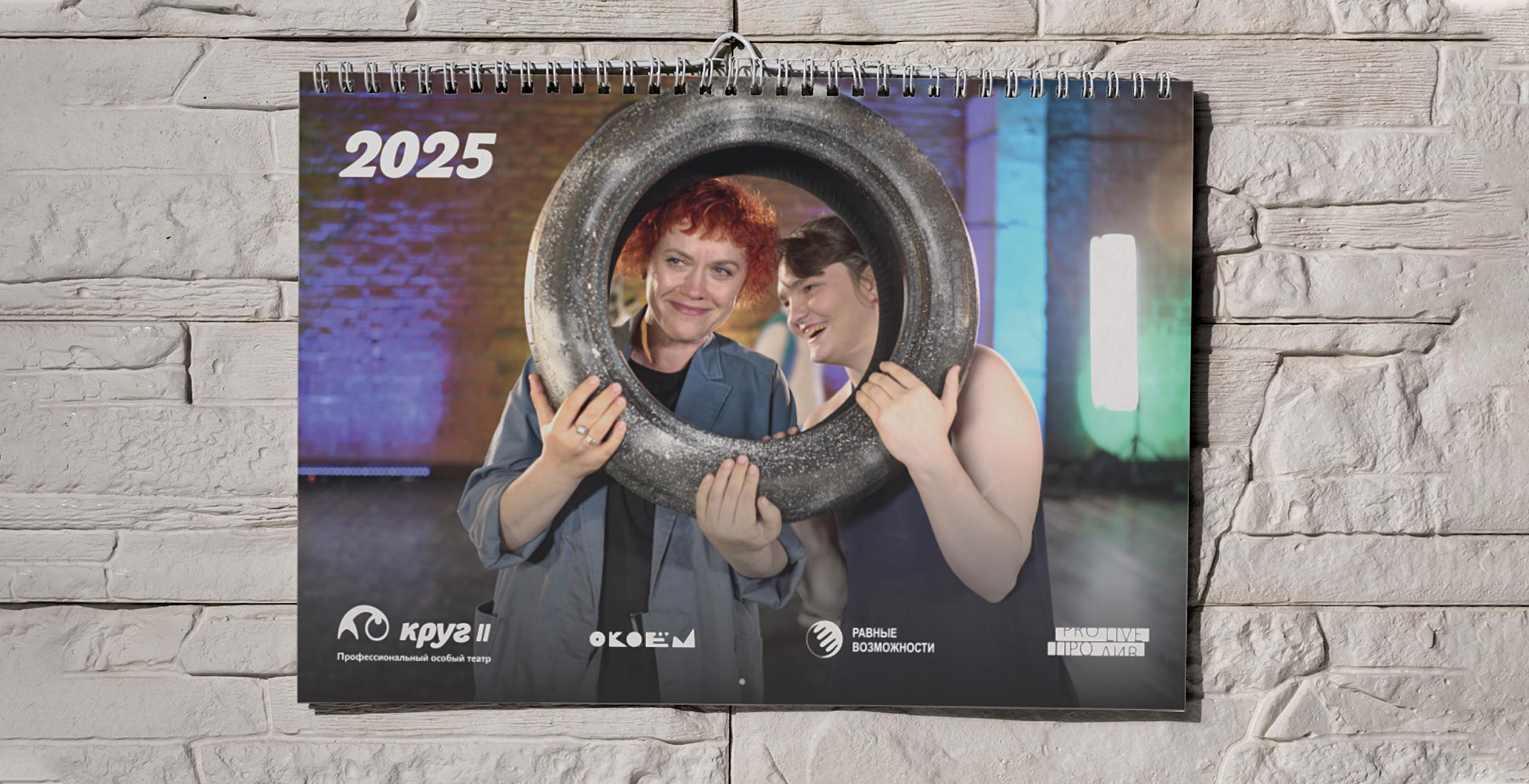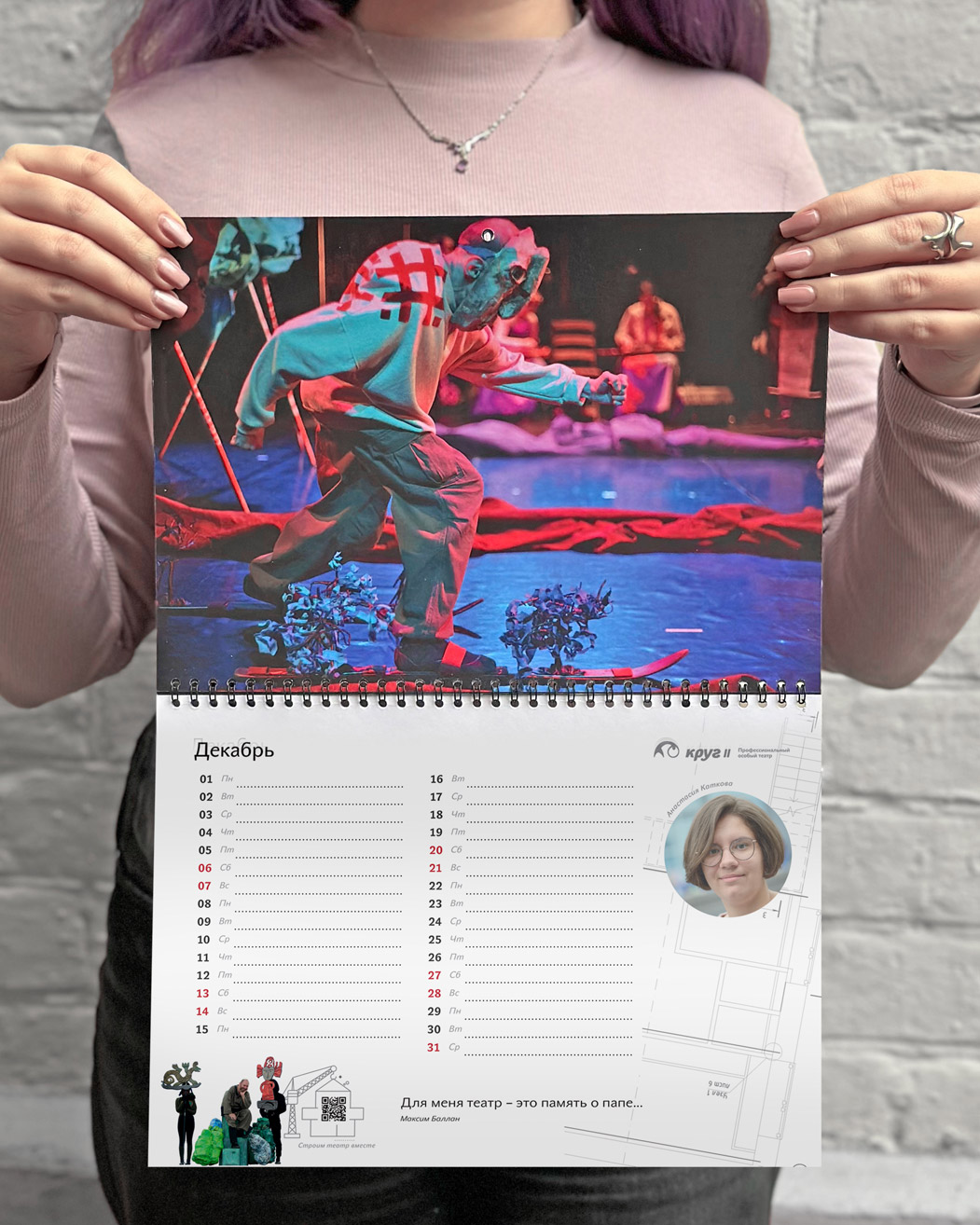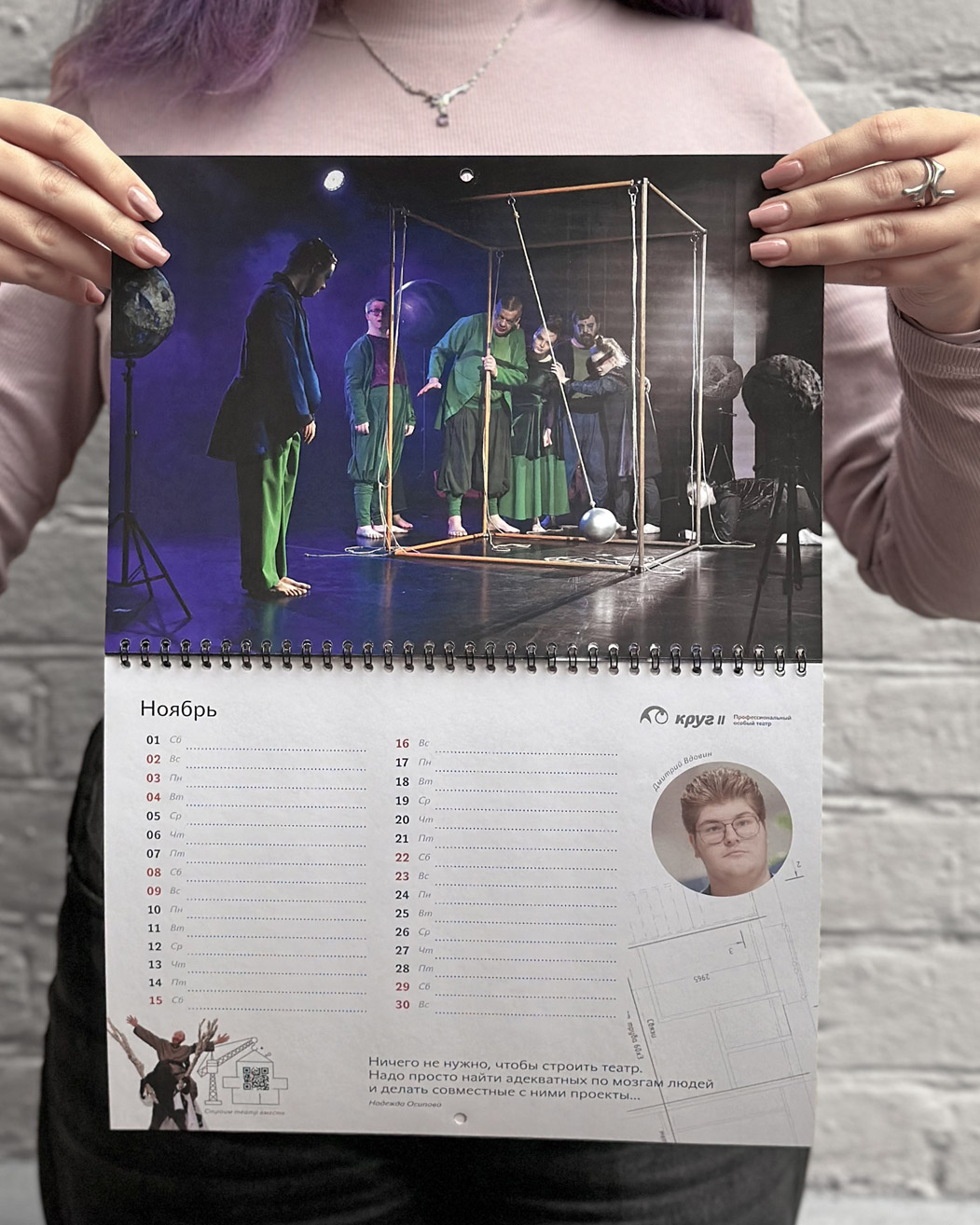 Особый театр «Круг II» — это профессиональный театр и обучающая театральная студия для людей с особенностями развития. На страницах календаря актеры размышляют над тем, что необходимо для строительства театра. Сквозь весь календарь нас сопровождает персонаж Степан из спектакля «Медь, малахит и ящерка». Он как будто строит здание театра в течение всего года. Фоном календаря служат чертежи дизайн-проекта театра, ждущие реализации.
