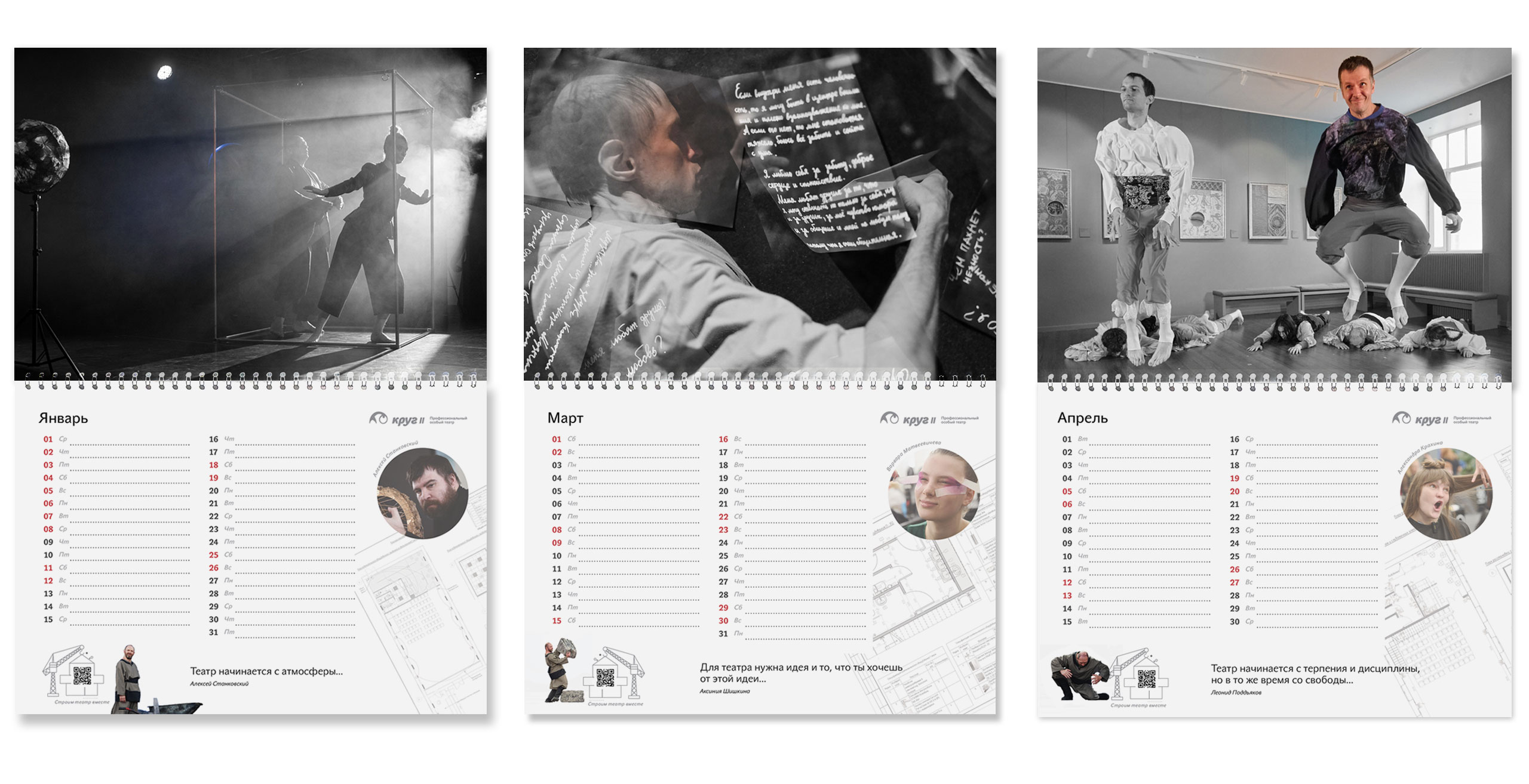 С начала года, когда январь полностью монохромный, постепенно к календарю добавляются краски, отражая рост, движение и преображение — как и процесс создания театра, который становится всё ярче с каждым месяцем.